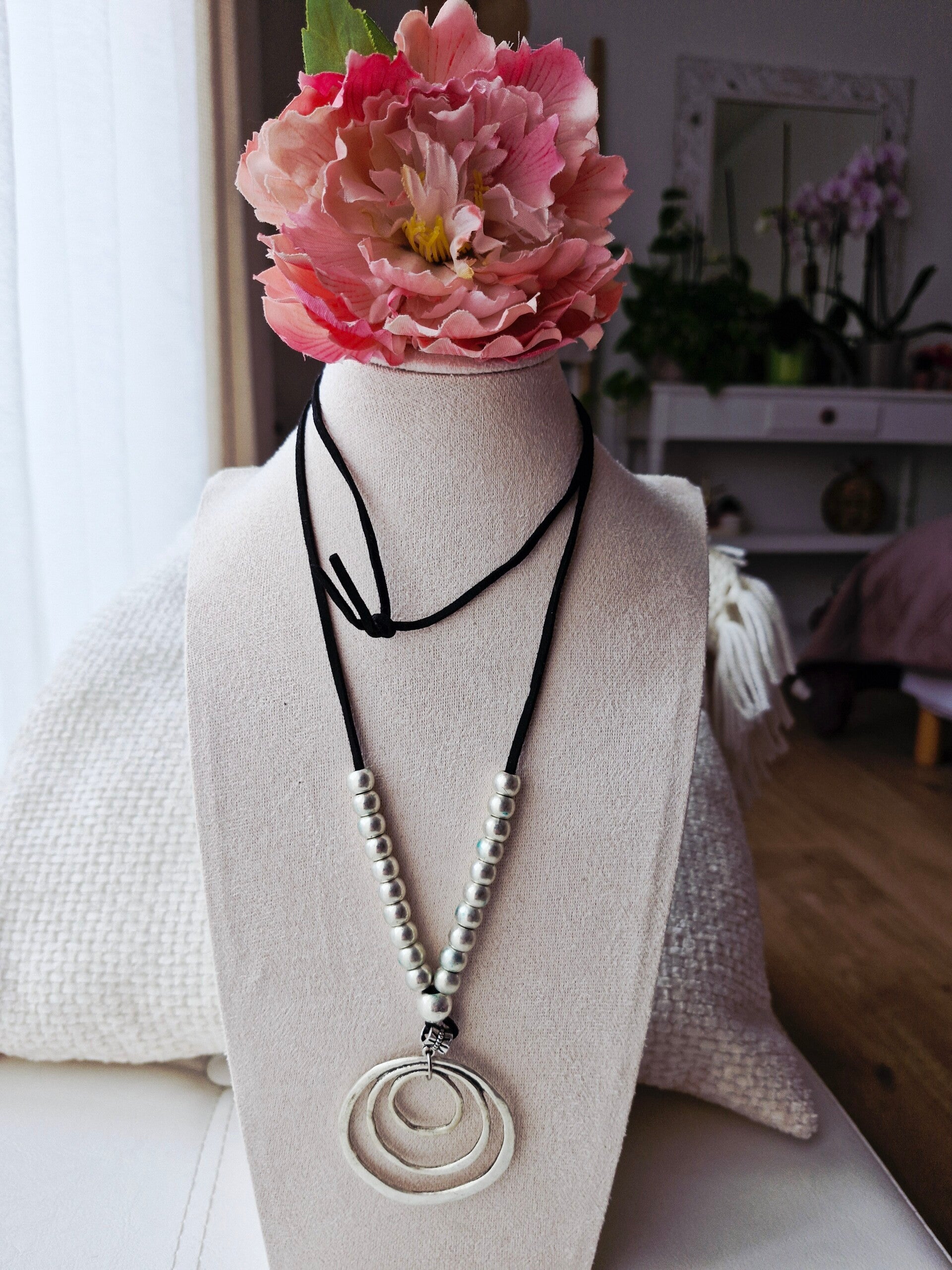 Calvin est un collier long fait main monté sur un cordon en cuir noir.